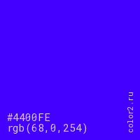 Цвет #4400FE в цветовой модели RGB обозначается тремя октетами (68, 0, 254) в десятичном формате и #4400FE в шестнадцатиричном (hex) формате, которые являются интенсивностью красного 68 (hex 44), интенсивность зелёного 0 (hex 00) и интенсивность синего 254 (hex FE).