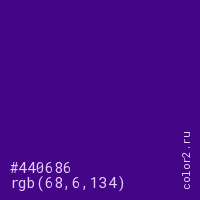 Цвет #440686 в цветовой модели RGB обозначается тремя октетами (68, 6, 134) в десятичном формате и #440686 в шестнадцатиричном (hex) формате, которые являются интенсивностью красного 68 (hex 44), интенсивность зелёного 6 (hex 06) и интенсивность синего 134 (hex 86).