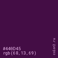 Цвет #440D45 в цветовой модели RGB обозначается тремя октетами (68, 13, 69) в десятичном формате и #440D45 в шестнадцатиричном (hex) формате, которые являются интенсивностью красного 68 (hex 44), интенсивность зелёного 13 (hex 0D) и интенсивность синего 69 (hex 45).