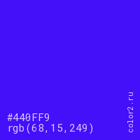 Цвет #440FF9 в цветовой модели RGB обозначается тремя октетами (68, 15, 249) в десятичном формате и #440FF9 в шестнадцатиричном (hex) формате, которые являются интенсивностью красного 68 (hex 44), интенсивность зелёного 15 (hex 0F) и интенсивность синего 249 (hex F9).