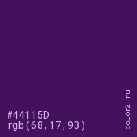 Цвет #44115D в цветовой модели RGB обозначается тремя октетами (68, 17, 93) в десятичном формате и #44115D в шестнадцатиричном (hex) формате, которые являются интенсивностью красного 68 (hex 44), интенсивность зелёного 17 (hex 11) и интенсивность синего 93 (hex 5D).