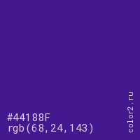 Цвет #44188F в цветовой модели RGB обозначается тремя октетами (68, 24, 143) в десятичном формате и #44188F в шестнадцатиричном (hex) формате, которые являются интенсивностью красного 68 (hex 44), интенсивность зелёного 24 (hex 18) и интенсивность синего 143 (hex 8F).