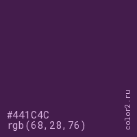 Цвет #441C4C в цветовой модели RGB обозначается тремя октетами (68, 28, 76) в десятичном формате и #441C4C в шестнадцатиричном (hex) формате, которые являются интенсивностью красного 68 (hex 44), интенсивность зелёного 28 (hex 1C) и интенсивность синего 76 (hex 4C).