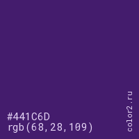 Цвет #441C6D в цветовой модели RGB обозначается тремя октетами (68, 28, 109) в десятичном формате и #441C6D в шестнадцатиричном (hex) формате, которые являются интенсивностью красного 68 (hex 44), интенсивность зелёного 28 (hex 1C) и интенсивность синего 109 (hex 6D).