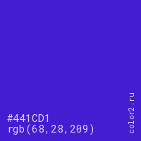 Цвет #441CD1 в цветовой модели RGB обозначается тремя октетами (68, 28, 209) в десятичном формате и #441CD1 в шестнадцатиричном (hex) формате, которые являются интенсивностью красного 68 (hex 44), интенсивность зелёного 28 (hex 1C) и интенсивность синего 209 (hex D1).