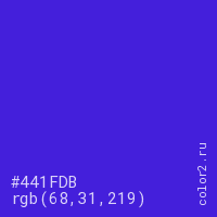 Цвет #441FDB в цветовой модели RGB обозначается тремя октетами (68, 31, 219) в десятичном формате и #441FDB в шестнадцатиричном (hex) формате, которые являются интенсивностью красного 68 (hex 44), интенсивность зелёного 31 (hex 1F) и интенсивность синего 219 (hex DB).