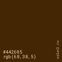 Цвет #442605 в цветовой модели RGB обозначается тремя октетами (68, 38, 5) в десятичном формате и #442605 в шестнадцатиричном (hex) формате, которые являются интенсивностью красного 68 (hex 44), интенсивность зелёного 38 (hex 26) и интенсивность синего 5 (hex 05).