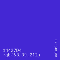 Цвет #4427D4 в цветовой модели RGB обозначается тремя октетами (68, 39, 212) в десятичном формате и #4427D4 в шестнадцатиричном (hex) формате, которые являются интенсивностью красного 68 (hex 44), интенсивность зелёного 39 (hex 27) и интенсивность синего 212 (hex D4).