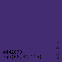 Цвет #442C73 в цветовой модели RGB обозначается тремя октетами (68, 44, 115) в десятичном формате и #442C73 в шестнадцатиричном (hex) формате, которые являются интенсивностью красного 68 (hex 44), интенсивность зелёного 44 (hex 2C) и интенсивность синего 115 (hex 73).
