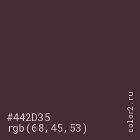 Цвет #442D35 в цветовой модели RGB обозначается тремя октетами (68, 45, 53) в десятичном формате и #442D35 в шестнадцатиричном (hex) формате, которые являются интенсивностью красного 68 (hex 44), интенсивность зелёного 45 (hex 2D) и интенсивность синего 53 (hex 35).