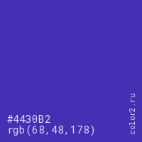 Цвет #4430B2 в цветовой модели RGB обозначается тремя октетами (68, 48, 178) в десятичном формате и #4430B2 в шестнадцатиричном (hex) формате, которые являются интенсивностью красного 68 (hex 44), интенсивность зелёного 48 (hex 30) и интенсивность синего 178 (hex B2).