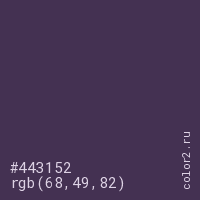 Цвет #443152 в цветовой модели RGB обозначается тремя октетами (68, 49, 82) в десятичном формате и #443152 в шестнадцатиричном (hex) формате, которые являются интенсивностью красного 68 (hex 44), интенсивность зелёного 49 (hex 31) и интенсивность синего 82 (hex 52).