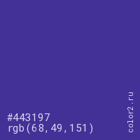 Цвет #443197 в цветовой модели RGB обозначается тремя октетами (68, 49, 151) в десятичном формате и #443197 в шестнадцатиричном (hex) формате, которые являются интенсивностью красного 68 (hex 44), интенсивность зелёного 49 (hex 31) и интенсивность синего 151 (hex 97).