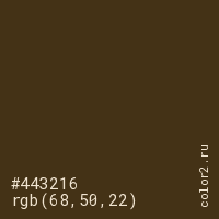 Цвет #443216 в цветовой модели RGB обозначается тремя октетами (68, 50, 22) в десятичном формате и #443216 в шестнадцатиричном (hex) формате, которые являются интенсивностью красного 68 (hex 44), интенсивность зелёного 50 (hex 32) и интенсивность синего 22 (hex 16).