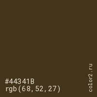 Цвет #44341B в цветовой модели RGB обозначается тремя октетами (68, 52, 27) в десятичном формате и #44341B в шестнадцатиричном (hex) формате, которые являются интенсивностью красного 68 (hex 44), интенсивность зелёного 52 (hex 34) и интенсивность синего 27 (hex 1B).