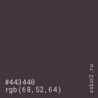 Цвет #443440 в цветовой модели RGB обозначается тремя октетами (68, 52, 64) в десятичном формате и #443440 в шестнадцатиричном (hex) формате, которые являются интенсивностью красного 68 (hex 44), интенсивность зелёного 52 (hex 34) и интенсивность синего 64 (hex 40).