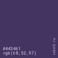 Цвет #443461 в цветовой модели RGB обозначается тремя октетами (68, 52, 97) в десятичном формате и #443461 в шестнадцатиричном (hex) формате, которые являются интенсивностью красного 68 (hex 44), интенсивность зелёного 52 (hex 34) и интенсивность синего 97 (hex 61).