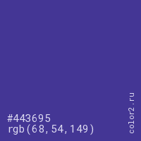 Цвет #443695 в цветовой модели RGB обозначается тремя октетами (68, 54, 149) в десятичном формате и #443695 в шестнадцатиричном (hex) формате, которые являются интенсивностью красного 68 (hex 44), интенсивность зелёного 54 (hex 36) и интенсивность синего 149 (hex 95).