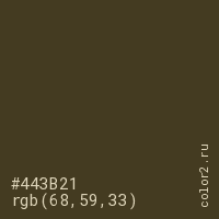 Цвет #443B21 в цветовой модели RGB обозначается тремя октетами (68, 59, 33) в десятичном формате и #443B21 в шестнадцатиричном (hex) формате, которые являются интенсивностью красного 68 (hex 44), интенсивность зелёного 59 (hex 3B) и интенсивность синего 33 (hex 21).