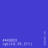 Цвет #443BD3 в цветовой модели RGB обозначается тремя октетами (68, 59, 211) в десятичном формате и #443BD3 в шестнадцатиричном (hex) формате, которые являются интенсивностью красного 68 (hex 44), интенсивность зелёного 59 (hex 3B) и интенсивность синего 211 (hex D3).