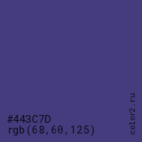 Цвет #443C7D в цветовой модели RGB обозначается тремя октетами (68, 60, 125) в десятичном формате и #443C7D в шестнадцатиричном (hex) формате, которые являются интенсивностью красного 68 (hex 44), интенсивность зелёного 60 (hex 3C) и интенсивность синего 125 (hex 7D).