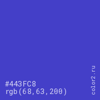 Цвет #443FC8 в цветовой модели RGB обозначается тремя октетами (68, 63, 200) в десятичном формате и #443FC8 в шестнадцатиричном (hex) формате, которые являются интенсивностью красного 68 (hex 44), интенсивность зелёного 63 (hex 3F) и интенсивность синего 200 (hex C8).