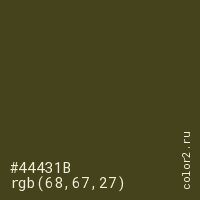 Цвет #44431B в цветовой модели RGB обозначается тремя октетами (68, 67, 27) в десятичном формате и #44431B в шестнадцатиричном (hex) формате, которые являются интенсивностью красного 68 (hex 44), интенсивность зелёного 67 (hex 43) и интенсивность синего 27 (hex 1B).