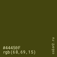 Цвет #44450F в цветовой модели RGB обозначается тремя октетами (68, 69, 15) в десятичном формате и #44450F в шестнадцатиричном (hex) формате, которые являются интенсивностью красного 68 (hex 44), интенсивность зелёного 69 (hex 45) и интенсивность синего 15 (hex 0F).
