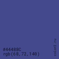 Цвет #44488C в цветовой модели RGB обозначается тремя октетами (68, 72, 140) в десятичном формате и #44488C в шестнадцатиричном (hex) формате, которые являются интенсивностью красного 68 (hex 44), интенсивность зелёного 72 (hex 48) и интенсивность синего 140 (hex 8C).