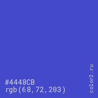 Цвет #4448CB в цветовой модели RGB обозначается тремя октетами (68, 72, 203) в десятичном формате и #4448CB в шестнадцатиричном (hex) формате, которые являются интенсивностью красного 68 (hex 44), интенсивность зелёного 72 (hex 48) и интенсивность синего 203 (hex CB).
