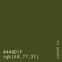 Цвет #444D1F в цветовой модели RGB обозначается тремя октетами (68, 77, 31) в десятичном формате и #444D1F в шестнадцатиричном (hex) формате, которые являются интенсивностью красного 68 (hex 44), интенсивность зелёного 77 (hex 4D) и интенсивность синего 31 (hex 1F).