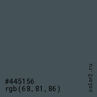 Цвет #445156 в цветовой модели RGB обозначается тремя октетами (68, 81, 86) в десятичном формате и #445156 в шестнадцатиричном (hex) формате, которые являются интенсивностью красного 68 (hex 44), интенсивность зелёного 81 (hex 51) и интенсивность синего 86 (hex 56).