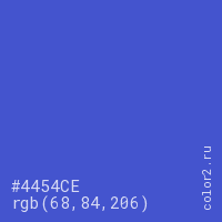 Цвет #4454CE в цветовой модели RGB обозначается тремя октетами (68, 84, 206) в десятичном формате и #4454CE в шестнадцатиричном (hex) формате, которые являются интенсивностью красного 68 (hex 44), интенсивность зелёного 84 (hex 54) и интенсивность синего 206 (hex CE).