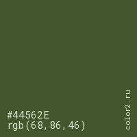 Цвет #44562E в цветовой модели RGB обозначается тремя октетами (68, 86, 46) в десятичном формате и #44562E в шестнадцатиричном (hex) формате, которые являются интенсивностью красного 68 (hex 44), интенсивность зелёного 86 (hex 56) и интенсивность синего 46 (hex 2E).