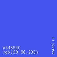 Цвет #4456EC в цветовой модели RGB обозначается тремя октетами (68, 86, 236) в десятичном формате и #4456EC в шестнадцатиричном (hex) формате, которые являются интенсивностью красного 68 (hex 44), интенсивность зелёного 86 (hex 56) и интенсивность синего 236 (hex EC).