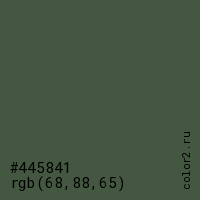 Цвет #445841 в цветовой модели RGB обозначается тремя октетами (68, 88, 65) в десятичном формате и #445841 в шестнадцатиричном (hex) формате, которые являются интенсивностью красного 68 (hex 44), интенсивность зелёного 88 (hex 58) и интенсивность синего 65 (hex 41).