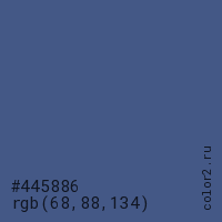 Цвет #445886 в цветовой модели RGB обозначается тремя октетами (68, 88, 134) в десятичном формате и #445886 в шестнадцатиричном (hex) формате, которые являются интенсивностью красного 68 (hex 44), интенсивность зелёного 88 (hex 58) и интенсивность синего 134 (hex 86).