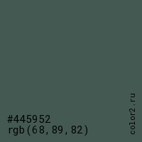 Цвет #445952 в цветовой модели RGB обозначается тремя октетами (68, 89, 82) в десятичном формате и #445952 в шестнадцатиричном (hex) формате, которые являются интенсивностью красного 68 (hex 44), интенсивность зелёного 89 (hex 59) и интенсивность синего 82 (hex 52).