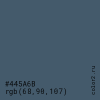 Цвет #445A6B в цветовой модели RGB обозначается тремя октетами (68, 90, 107) в десятичном формате и #445A6B в шестнадцатиричном (hex) формате, которые являются интенсивностью красного 68 (hex 44), интенсивность зелёного 90 (hex 5A) и интенсивность синего 107 (hex 6B).