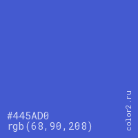 Цвет #445AD0 в цветовой модели RGB обозначается тремя октетами (68, 90, 208) в десятичном формате и #445AD0 в шестнадцатиричном (hex) формате, которые являются интенсивностью красного 68 (hex 44), интенсивность зелёного 90 (hex 5A) и интенсивность синего 208 (hex D0).