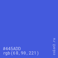 Цвет #445ADD в цветовой модели RGB обозначается тремя октетами (68, 90, 221) в десятичном формате и #445ADD в шестнадцатиричном (hex) формате, которые являются интенсивностью красного 68 (hex 44), интенсивность зелёного 90 (hex 5A) и интенсивность синего 221 (hex DD).