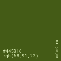 Цвет #445B16 в цветовой модели RGB обозначается тремя октетами (68, 91, 22) в десятичном формате и #445B16 в шестнадцатиричном (hex) формате, которые являются интенсивностью красного 68 (hex 44), интенсивность зелёного 91 (hex 5B) и интенсивность синего 22 (hex 16).