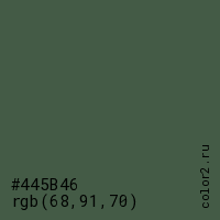 Цвет #445B46 в цветовой модели RGB обозначается тремя октетами (68, 91, 70) в десятичном формате и #445B46 в шестнадцатиричном (hex) формате, которые являются интенсивностью красного 68 (hex 44), интенсивность зелёного 91 (hex 5B) и интенсивность синего 70 (hex 46).
