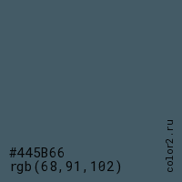 Цвет #445B66 в цветовой модели RGB обозначается тремя октетами (68, 91, 102) в десятичном формате и #445B66 в шестнадцатиричном (hex) формате, которые являются интенсивностью красного 68 (hex 44), интенсивность зелёного 91 (hex 5B) и интенсивность синего 102 (hex 66).