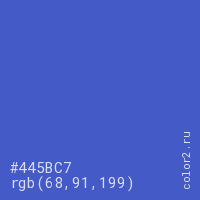 Цвет #445BC7 в цветовой модели RGB обозначается тремя октетами (68, 91, 199) в десятичном формате и #445BC7 в шестнадцатиричном (hex) формате, которые являются интенсивностью красного 68 (hex 44), интенсивность зелёного 91 (hex 5B) и интенсивность синего 199 (hex C7).
