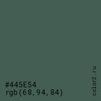 Цвет #445E54 в цветовой модели RGB обозначается тремя октетами (68, 94, 84) в десятичном формате и #445E54 в шестнадцатиричном (hex) формате, которые являются интенсивностью красного 68 (hex 44), интенсивность зелёного 94 (hex 5E) и интенсивность синего 84 (hex 54).