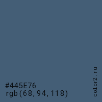 Цвет #445E76 в цветовой модели RGB обозначается тремя октетами (68, 94, 118) в десятичном формате и #445E76 в шестнадцатиричном (hex) формате, которые являются интенсивностью красного 68 (hex 44), интенсивность зелёного 94 (hex 5E) и интенсивность синего 118 (hex 76).