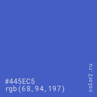 Цвет #445EC5 в цветовой модели RGB обозначается тремя октетами (68, 94, 197) в десятичном формате и #445EC5 в шестнадцатиричном (hex) формате, которые являются интенсивностью красного 68 (hex 44), интенсивность зелёного 94 (hex 5E) и интенсивность синего 197 (hex C5).