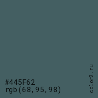 Цвет #445F62 в цветовой модели RGB обозначается тремя октетами (68, 95, 98) в десятичном формате и #445F62 в шестнадцатиричном (hex) формате, которые являются интенсивностью красного 68 (hex 44), интенсивность зелёного 95 (hex 5F) и интенсивность синего 98 (hex 62).