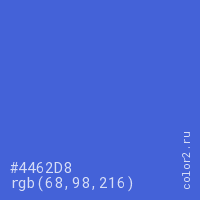 Цвет #4462D8 в цветовой модели RGB обозначается тремя октетами (68, 98, 216) в десятичном формате и #4462D8 в шестнадцатиричном (hex) формате, которые являются интенсивностью красного 68 (hex 44), интенсивность зелёного 98 (hex 62) и интенсивность синего 216 (hex D8).